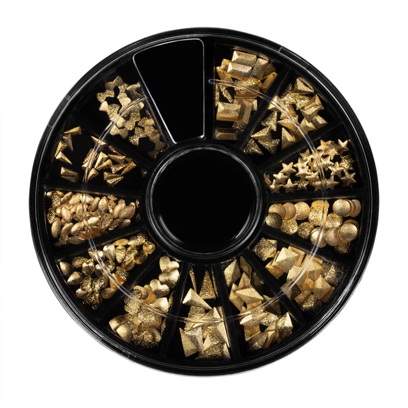Le carrousel d'ornements 04 est une collection de strass dorés de douze formes différentes. Vous retrouverez des étoiles, des cristaux, des carrés, des cœurs, des gouttes, des triangles et même des cercles décoratifs. Les éléments ont des tailles différentes - de 2 à 6 mm. Ainsi, vous pourrez composer une manucure parfaite avec des bijoux qui correspondent à votre style.